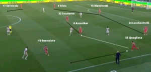 Nella partita con la viola i tre centrocampisti della viola sono stati costantemente pressati da Pickel, Zanimacchia e Escalante che più di una volta hanno conquistato il possesso palla. Giocando però in maniera veloce questo pressing può essere eluso, portando quindi portare a delle aperture in alcune zone del campo (immagine 3).