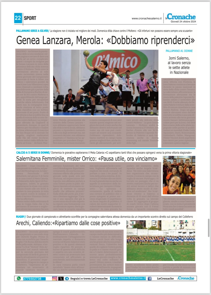 La Rassegna stampa di oggi sullo sport salernitano, 25 ottobre 2024