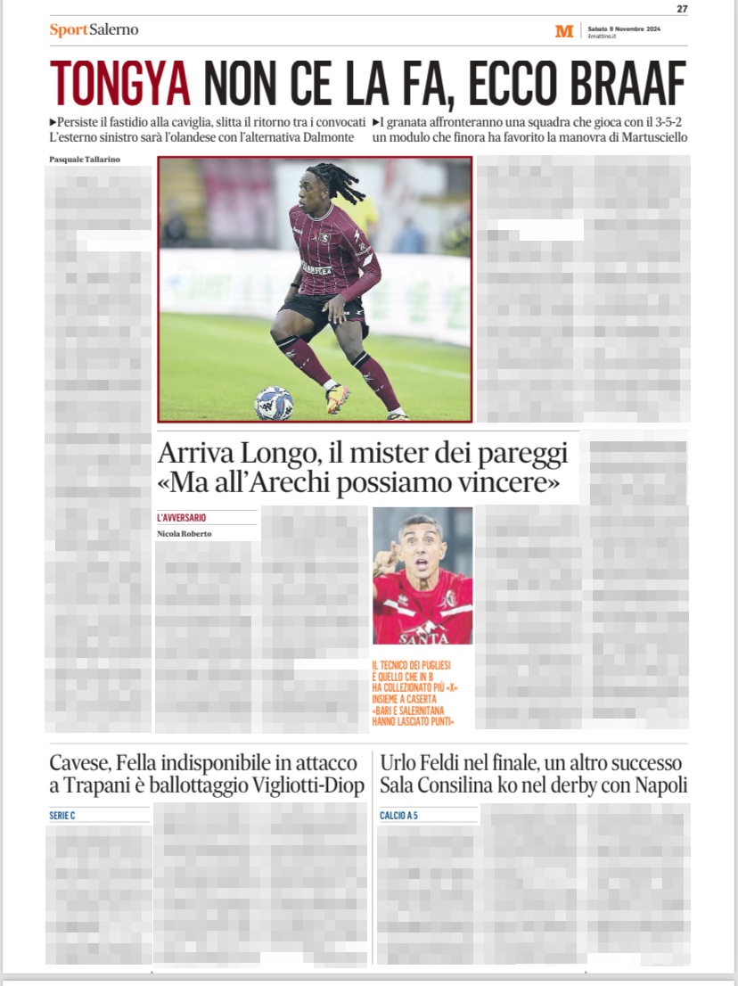 La Rassegna stampa di oggi sullo sport salernitano, 9 novembre 2024